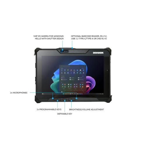 | Порти введення-виведення | Thunderbolt 4 (тип C) x 1 USB 3.2 Gen2 (тип A) x 1 Аудіовхід/аудіовихід (комбінований роз'єм) x 1 Карта microSD (microSDXC) x 1 10/100/1000 Ethernet (RJ45) x 1 Роз'єм для док-станції (20-контактний Pogo) x 1 Подвійна SIM-карта (Nano SIM та eSIM) Роз'єм DC-In x 1 Опціональний USB 3.2 Gen1 (тип C) x 13 Опціональний USB 3.2 Gen1 (тип A) x 13 Опціональний послідовний порт (RS232/RS422/RS485: D-sub, 9-контактний) x 13 Опціональний зчитувач штрих-кодів 1D/2D x 13 Опціональний другий 10/100/1000 Ethernet (RJ45) x 13 Опціональний зчитувач смарт-карт x 14 Опціональний пропускний канал для антени RF для GPS, WWAN і WLAN |